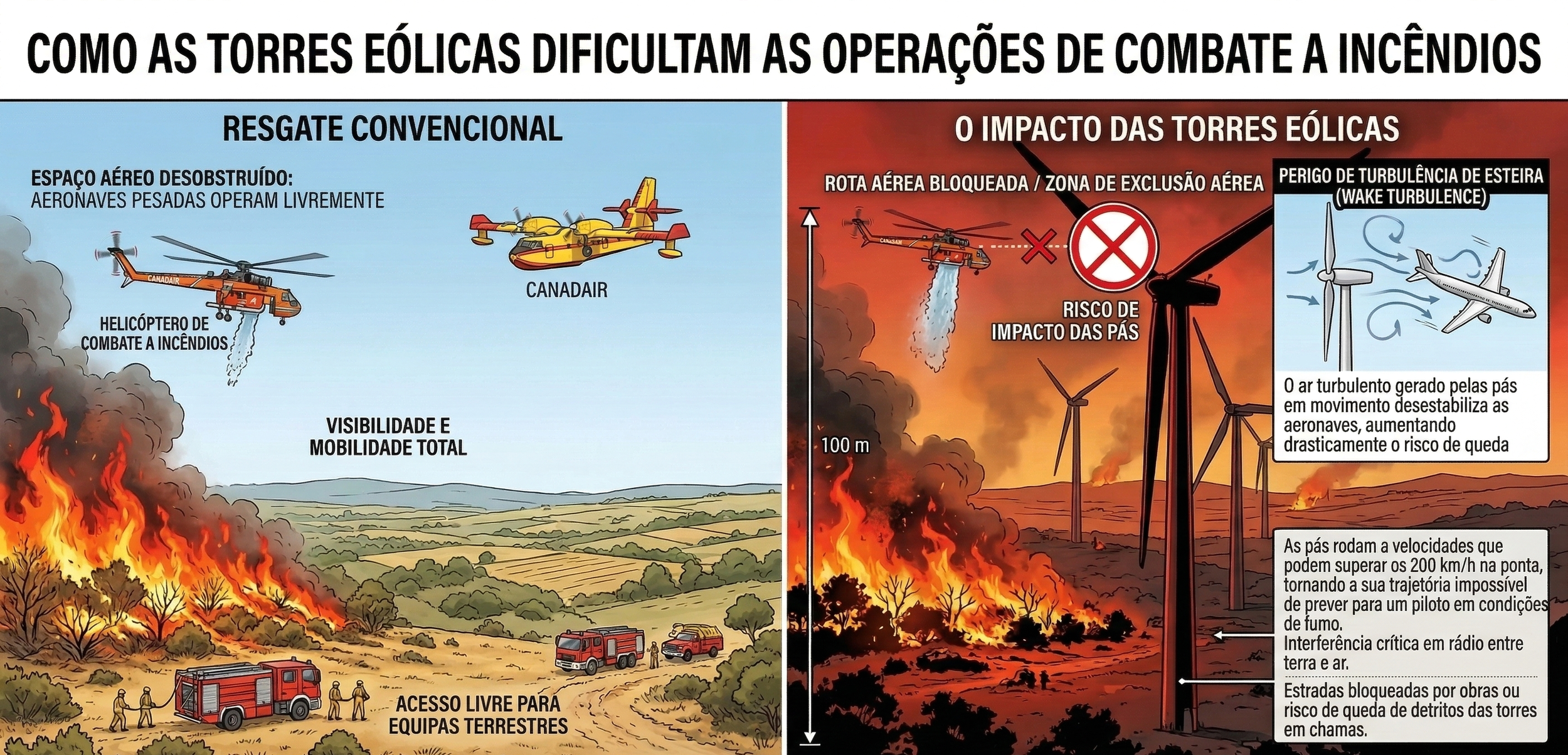 Mais grave ainda é a limitação que estas estruturas impõem ao combate a incêndios: a altura das torres e a fiação aérea criam obstáculos físicos intransponíveis para os meios aéreos de socorro. Em caso de fogo descontrolado, aviões e helicópteros ficam impedidos de operar com segurança devido ao risco de colisão e interferência, deixando a população e a floresta desprotegidas. Esta vulnerabilidade coloca em risco direto a vida dos habitantes e a integridade dos recursos hídricos locais. A construção das fundações massivas para os 19 aerogeradores — que consomem toneladas de betão por torre — e a manutenção da subestação podem causar a contaminação irreversível dos lençóis freáticos, os mesmos aquíferos que sustentam o consumo humano e a agricultura vital da região.